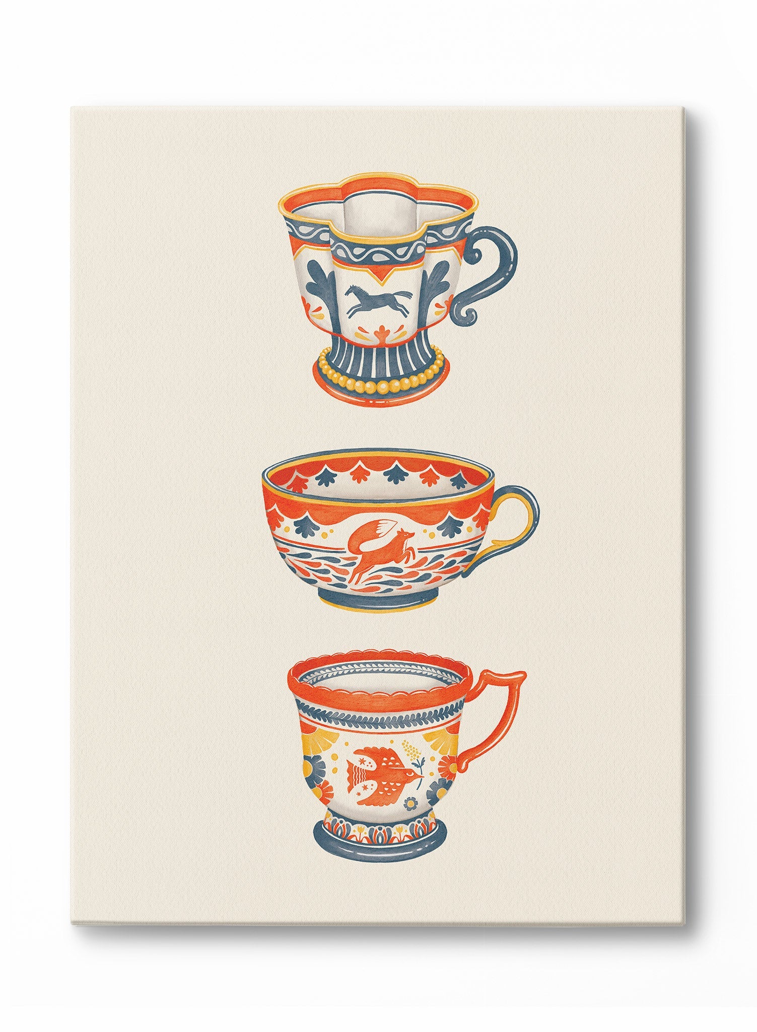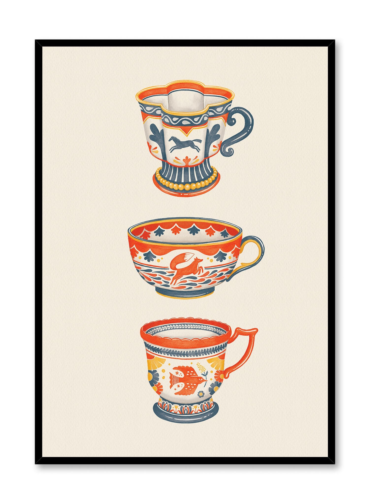 This print features a trio of intricately designed teacups, each adorned with unique patterns and motifs. The top cup showcases a prancing horse, surrounded by geometric shapes in deep blue and warm orange. The middle cup presents a leaping rabbit amidst a backdrop of stylized leaves and waves, while the bottom cup displays a charming fish motif, framed by delicate floral accents. The composition is set against a soft, cream background, allowing the vibrant colors and detailed designs to stand out.