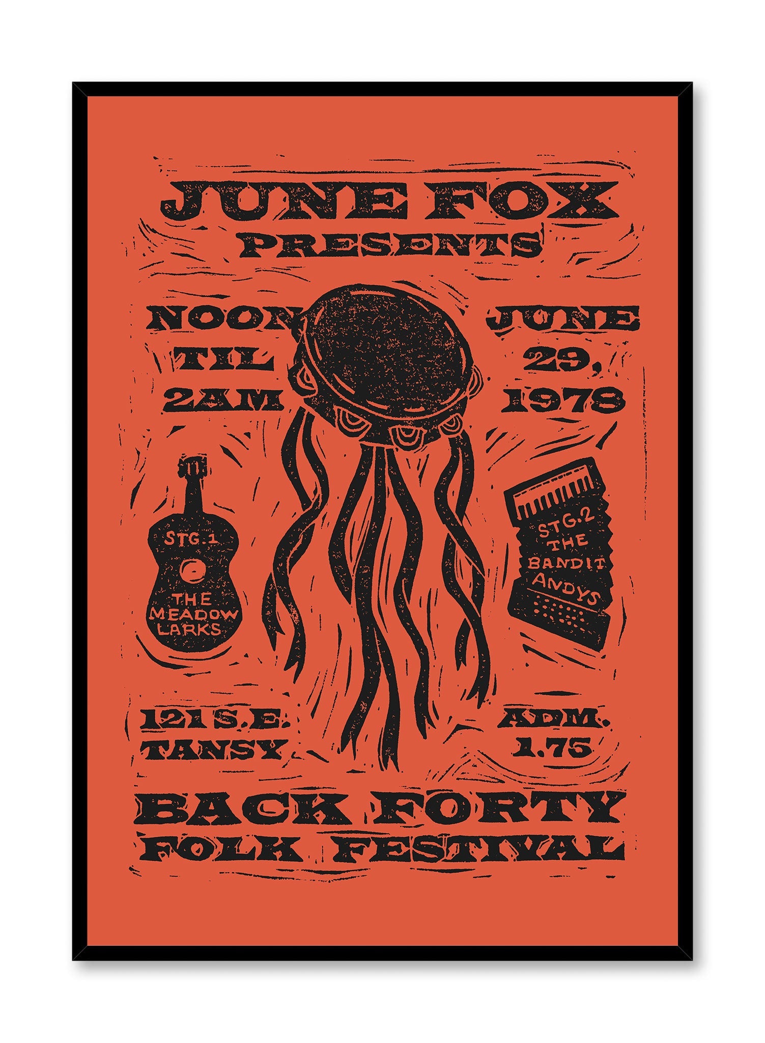 This striking print captures the essence of a vintage folk festival poster, featuring bold black illustrations against a vibrant orange background. Central to the design is a stylized jellyfish, its tentacles flowing gracefully, surrounded by text detailing the event. The typography is reminiscent of classic woodblock prints, adding a touch of nostalgia and authenticity to the piece.